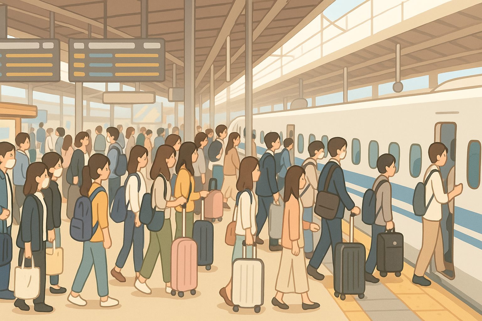 お盆シーズン(8月中旬頃)は、帰省需要が一斉に高まることから、GWと並んで新幹線「さくら」自由席の混雑が激化する時期です。特に8月10日(下りピーク)と8月17日(上りピーク)に混雑が集中します。たとえば会社や学校の夏休みに合わせて8月10日前後に移動を始める人が多く、実家や観光先での滞在を終えた乗客が8月17日前後に戻ってくる、というパターンです。